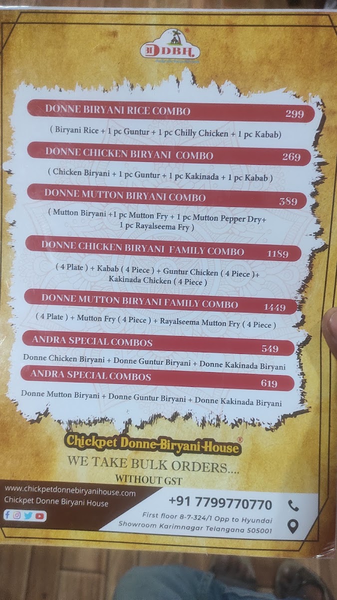Welcome to Chickpet Donne Biryani House Karimnagar, a culinary gem nestled in Stadium Road, Karimnagar. This restaurant pays homage to the famed Bengaluru-style donne biryani, renowned for its rich flavors and unique presentation. Each serving is traditionally wrapped in a banana leaf or eco-friendly donne cup, enhancing the aromatic experience and authentic taste.
